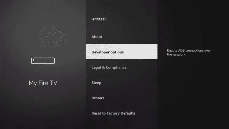 9: Choose Developer options. (If you don’t see it, click ‘About’, then click your Fire TV Stick name 7 times until it says ‘You are now a developer’).